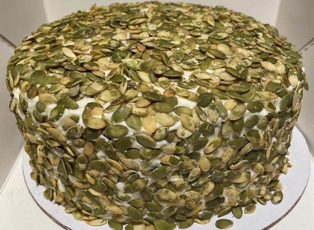 June – August - Pumpkin Cake w/ white chocolate pumpkin spice ganache and cream cheese icing $50
